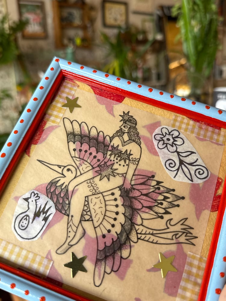 original drawing with painted frame, made with pen, colour pencil and acrylic on tracing, khadi and stencil paper 14.5cm x 14.5cm