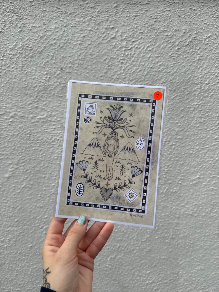 A5 print of a monoprint piece, collaged with stencil paper, colouring pencil amd mini drawings