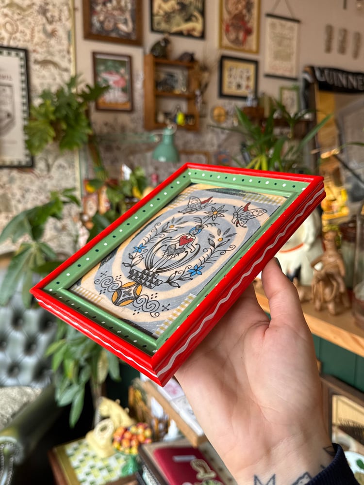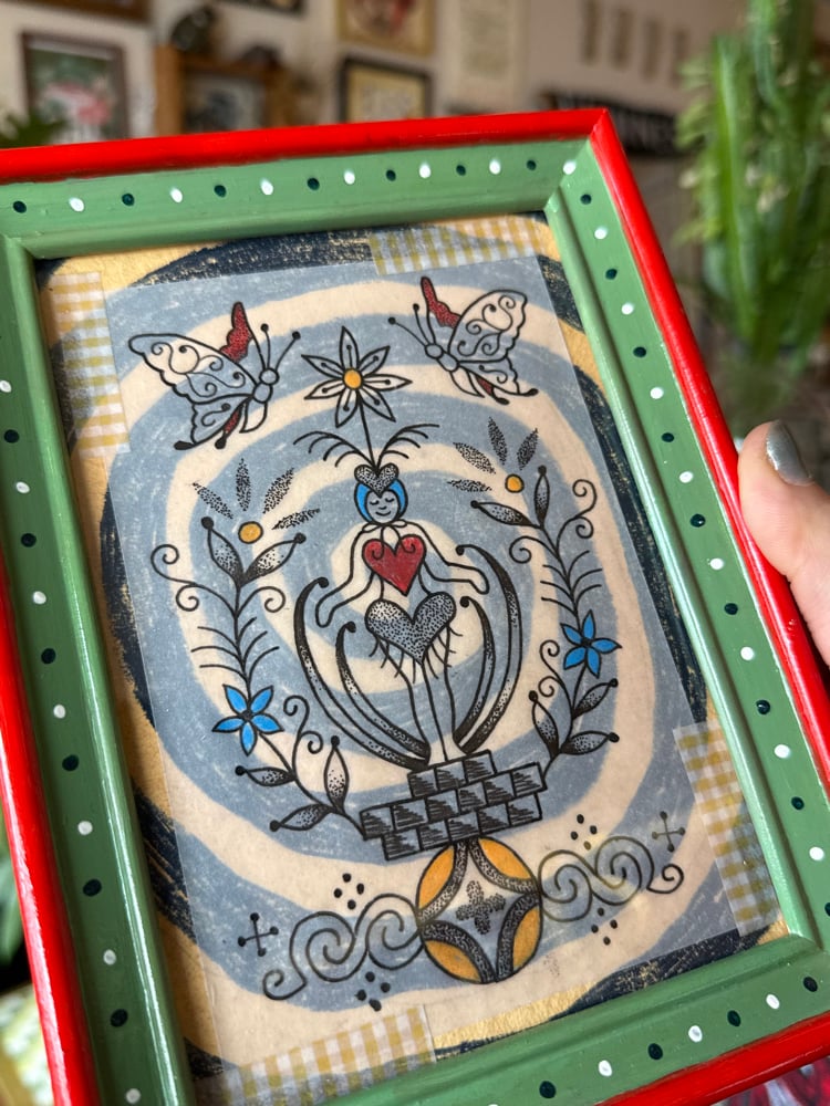 original drawing with painted frame, made using pen, colour pencil and acrylic on khadi and tracing paper 20cm x 15cm